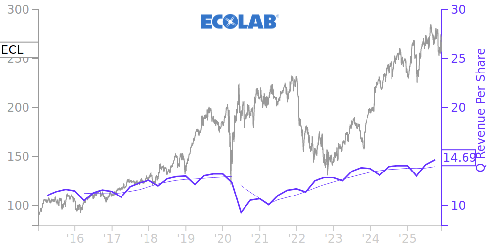 See how revenue, income, cash flow, and balance sheet financials have changed over 63 quarters since 2010. Compare with ECL stock chart to see long term trends.