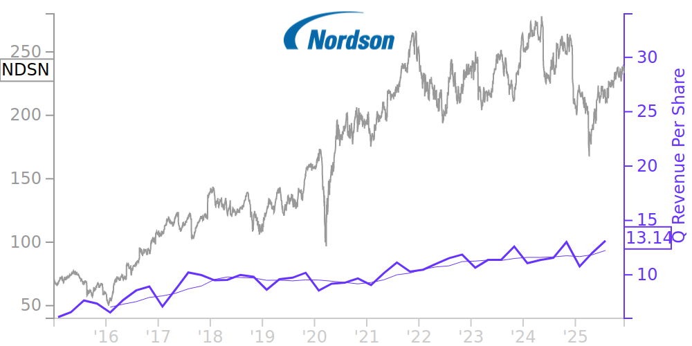 See how revenue, income, cash flow, and balance sheet financials have changed over 59 quarters since 2011. Compare with NDSN stock chart to see long term trends.