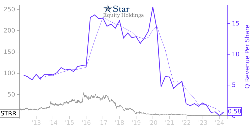 See how revenue, income, cash flow, and balance sheet financials have changed over 54 quarters since 2012. Compare with STRR stock chart to see long term trends.